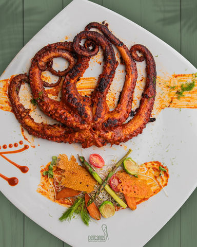 Pelicanos, situated on the corner of the main square in Puerto Morelos' Puerto side, directly across from Punto Corcho, stands out with its nautical charm. A large anchor greets you at the entrance, setting the tone for the maritime theme that runs throughout the restaurant. It's a family-friendly spot with both indoor and outdoor seating, allowing you to take in the tranquil view of the turquoise sea and the dock where boats create a picturesque backdrop.